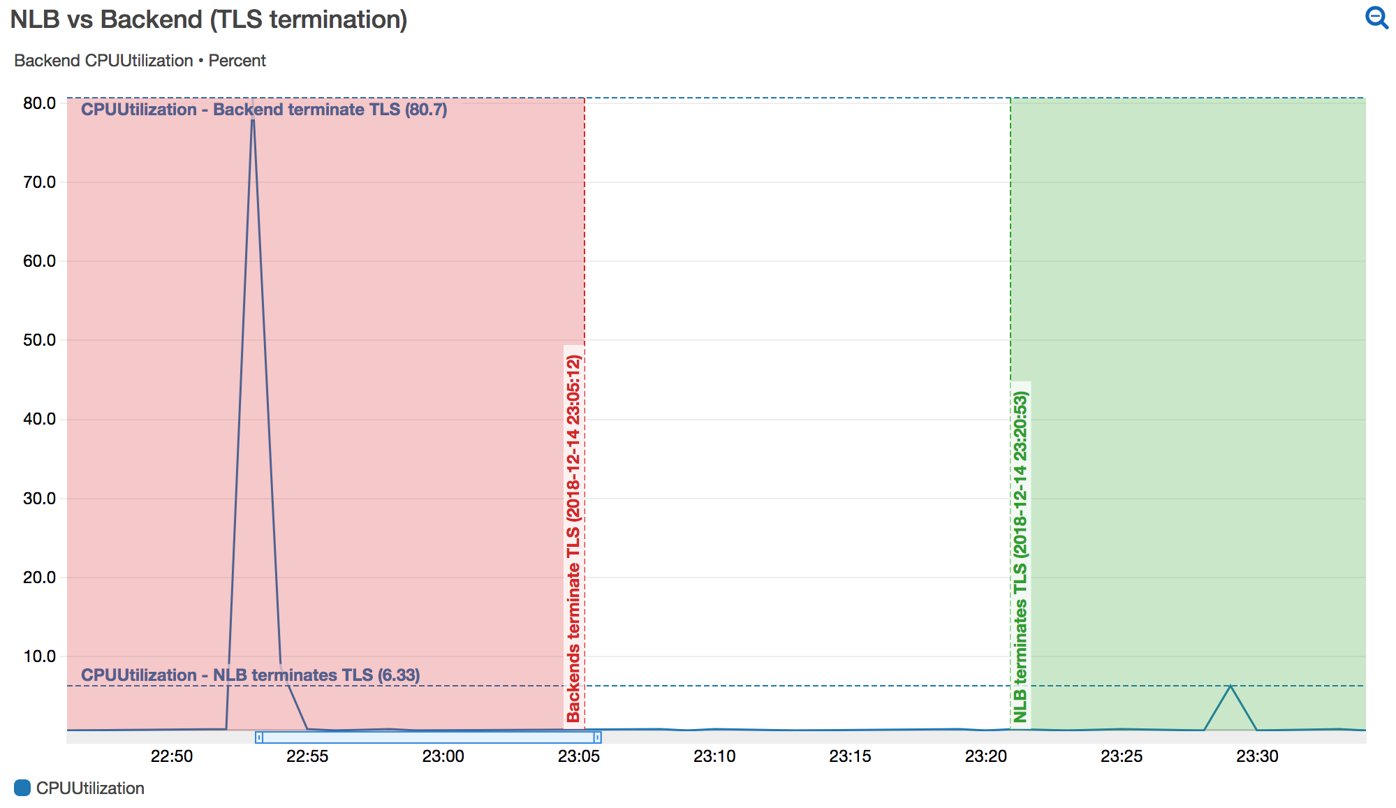 As it is illustrated in the metric above , the CPUUtilization of the EC2 instance went up to over 80% in the first test; while the CPUUtilization was only around 6% in the second test, where our Network Load Balancer terminated TLS connections.