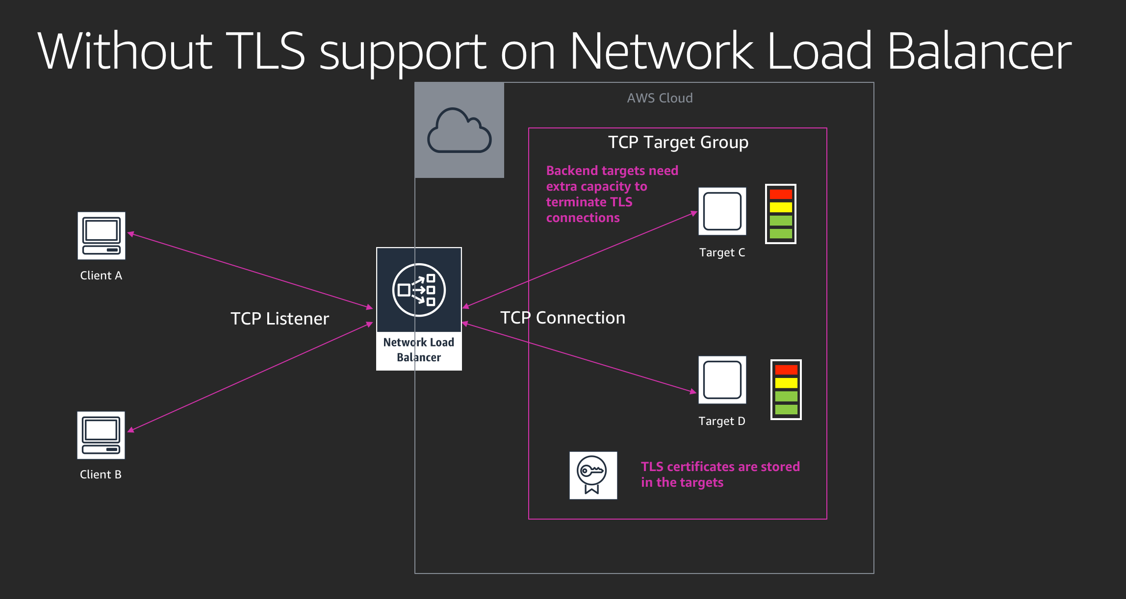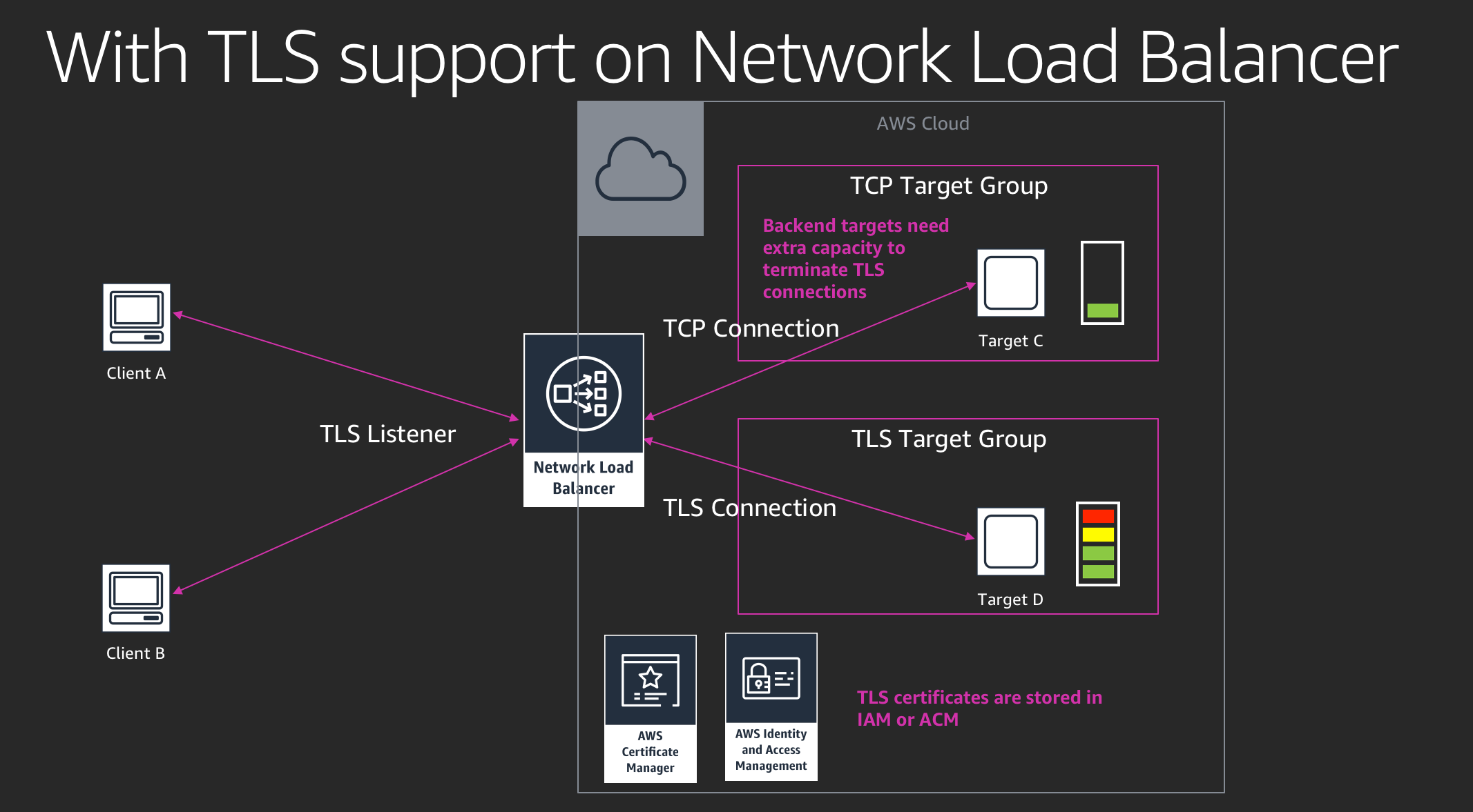 TLS Termination support on NLB will address these challenges. By offloading TLS from the backend servers to a high performant and scalable Network Load Balancer, you can now simplify certificate management, run backend servers optimally, support TLS connections at scale and keep your workloads always secure. Network Load Balancer also offers predefined security polices, which ensures that secured ciphers and protocols are being negotiated between the user and Network Load Balancer.