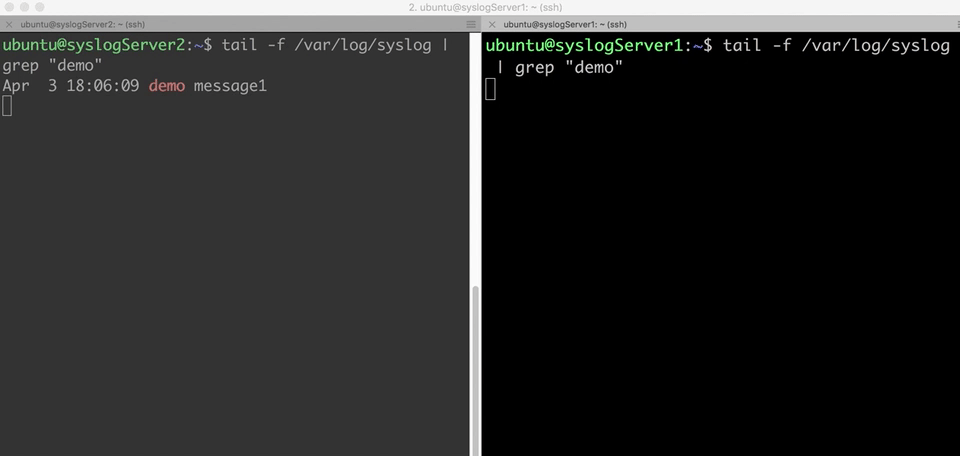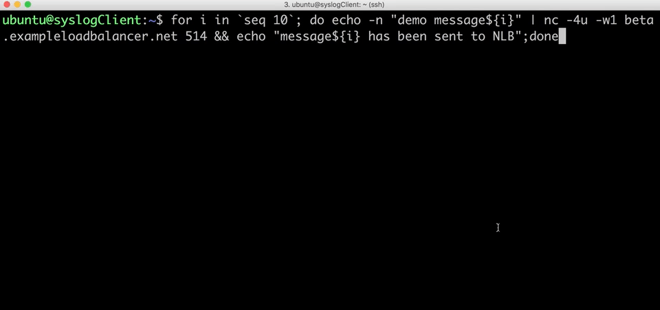4. This time, the Network Load Balancer forward the second log message to syslog server2 ---The terminal of syslog server2 shows that it receives the seond log message
